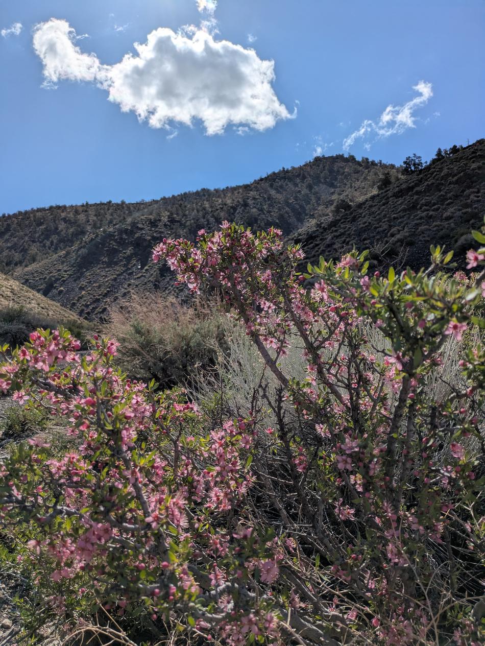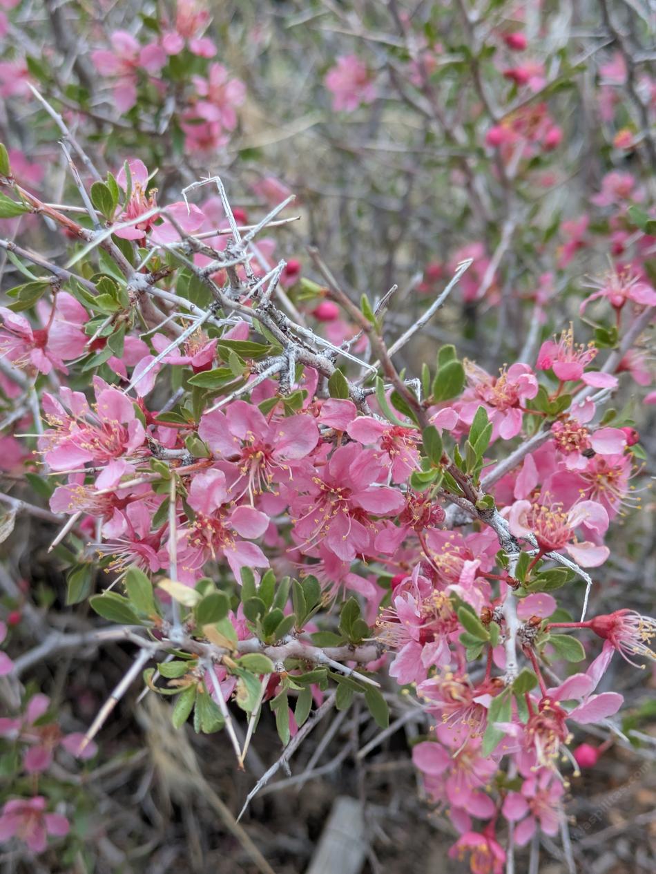Desert Peach, Prunus andersonii, is a deciduous shrub that grows to 3-6 ft., with rose pink flowers emerging in the spring. Native to eastern slopes of the Sierra Nevadas over into Nevada. This Prunus species likes sun, and good drainage. It makes a beautiful flower show. I've seen many photos of this taken by people who had no idea what it was. A decent wildlife plant. Water it for the first summer and then ignore. If you live in the lower desert you'll probably need to give it a little more water. (But not much!) Plants growing nearby, in full sun, are Grayia spinosa, Artemisia tridentata, and Elymus cinereus.